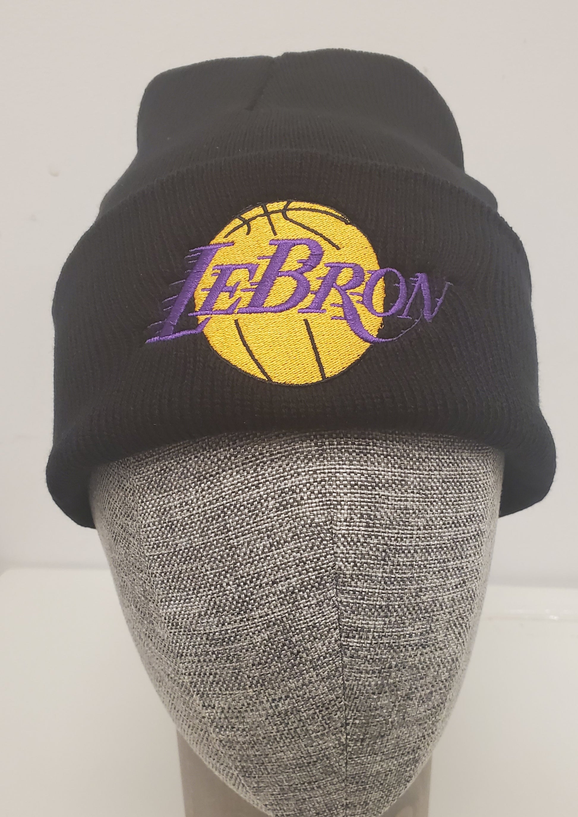 Black Unisex LeBron James "Laker" Logo Beenie. Black beanie with purple and gold logo.